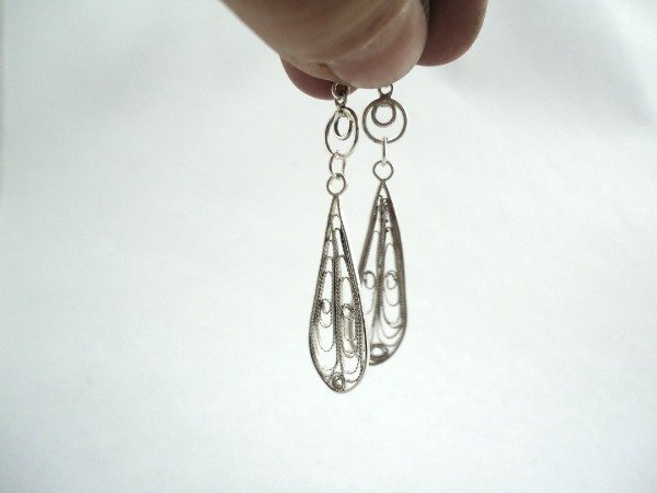 Aros colgantes en plata reciclada en forma de gota de filigrana. Joyería artesanal y sostenible hecha a mano. Moda atemporal. Pieza única. Joya exclusiva.